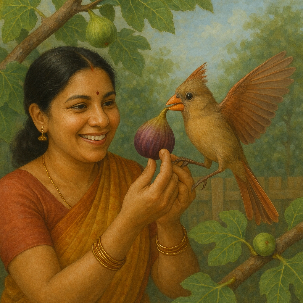 Two mothers—one South-Indian, one Texan red cardinal—have found themselves in a polite but spirited rivalry over the figs that ripen in our backyard.
